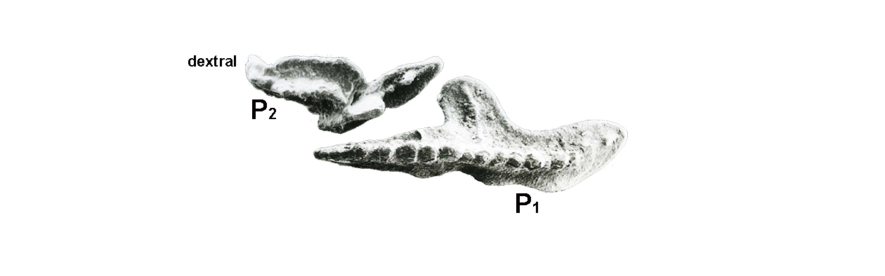 Diagnoza The platform elements of the apparatus are similar in outline to those of //Eoplacognathus foliaceus// but in both oz elements the row of denticles on the external process is split into two straight segments, the proximal one continuing somewhat further than the point at which it meets the distalone. Synonims: Eoplacognathus n. sp. A.; BERGSTROM,1971; Eoplacognathus cf. reclinatus (FAHRAEUS); NI, 1979; Eoplacognathus n. sp. A BERGSTROM; BERGSTROM, 1983; Eoplacognathus protoramosus sp. n.: CHEN et al., 1983; Eoplacognathus protoramosus CHEN, CHEN et al.; AN, 1987.\\ Porównanie All the specimens from the Mójcza Limestone are fragmentary but they are clearly conspecific with the one illustrated by BERGSTROM (1971). A much more numerous collection of the species has been derived from coeval strata of the borehole Lesieniec I, where the species also cooccurs with //E. reclinatus//. All the platform elements of the apparatus show a striking similarity to //E. foliaceus//, which is certainly the ancestor of the species. The only difference is in the angular bending of the denticle row in the external process of the oz elements with a tendency to develop a disruption in their course. These features strongly suggests a phylogenetic proximity to //"E." jianyeensis //(AN et DING) from the Llandeilo of Tatianbu Formation, Tangshan Hills near Nanjin, China, which connects it with more typical American species of Cahabagnathu//s//. Autekologia Występowanie geograficzne Zasięg czasowy In South China the species occurs in the E. reclinatus Subzone (see AN 1987: p.40), in the Lesieniec borehole, NE Poland in the E. robustus and E. lindstroemi Subzones. The occurrences in the Baltic area are of the latter age. In Mójcza it occurs from 0.3 to 1.1 m above the discontinuity (E. robustus Subzone). Materiały muzealne Literatura Dzik, J. 1994a Conodonts of the Mójcza Limestone. In: J. Dzik, E. Olempska, & A. Pisera. Ordovician carbonate platform of the Holy Cross Mountains. Palaeontologia Polonica 53, 43-128. |