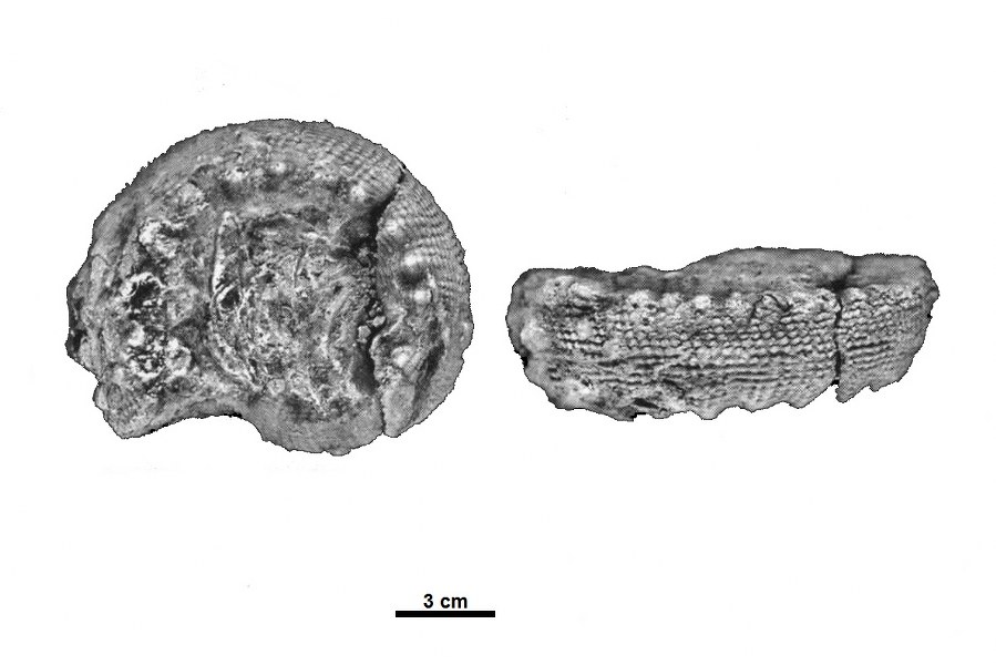 Diagnoza The lateral surface is inclined somewhat abapically, the umbilicus is quite wide. The top is ornamented with an adapical row of numerous tubercles, about 35 on the last coil of the smaller specimen. They become larger and more extensive in the course of ontogeny. They protrude slightly above the surface of the convolution in side view so that the area between the row of tubercles and the adapical suture is concave. The top (including the tubercles) is covered with spiral ribs. The side surface is slightly convex and completely covered with spiral ribs. These are crossed by equally strong or slightly stronger opisthocyrte axial ribs (or reinforced growth lines) and weakly tubercular. The border of the umbilicus forms a series of strong tubercles (approx. 20), which are also covered with spiral ribs. Porównanie Straparollus sapho d'Orbigny, 1853 has axial ribs on the upper side that form nodes on the edge to the lateral side (only approx. 17 on the last turn), the number of tubercles on the underside is also smaller and the lateral side lacks the lattice of spiral and axial ribs. Autekologia Występowanie geograficzne Only in type locality Zasięg czasowy Mid Jurassic. Materiały muzealne 2 specimen from Balin (NHMW 1867/0008/0020 a, b) Literatura Gründel, J. 2012. Neubearbeitung der von Laube 1867 beschriebenen Gastropoden fauna aus dem mittleren Jura von Balin/Polen. Annalen des Naturhistorischen Museums in Wien. Serie A, 114, 193–288. |