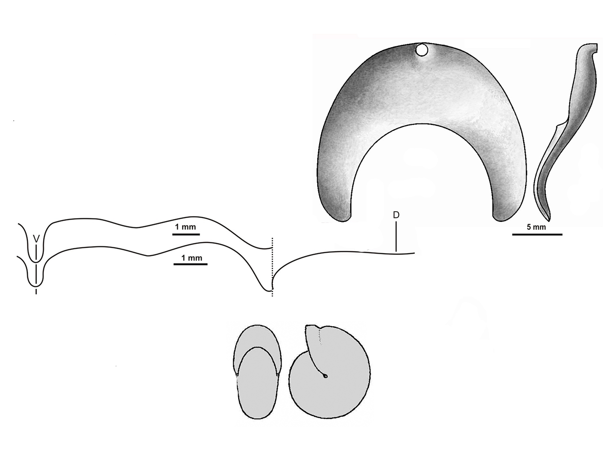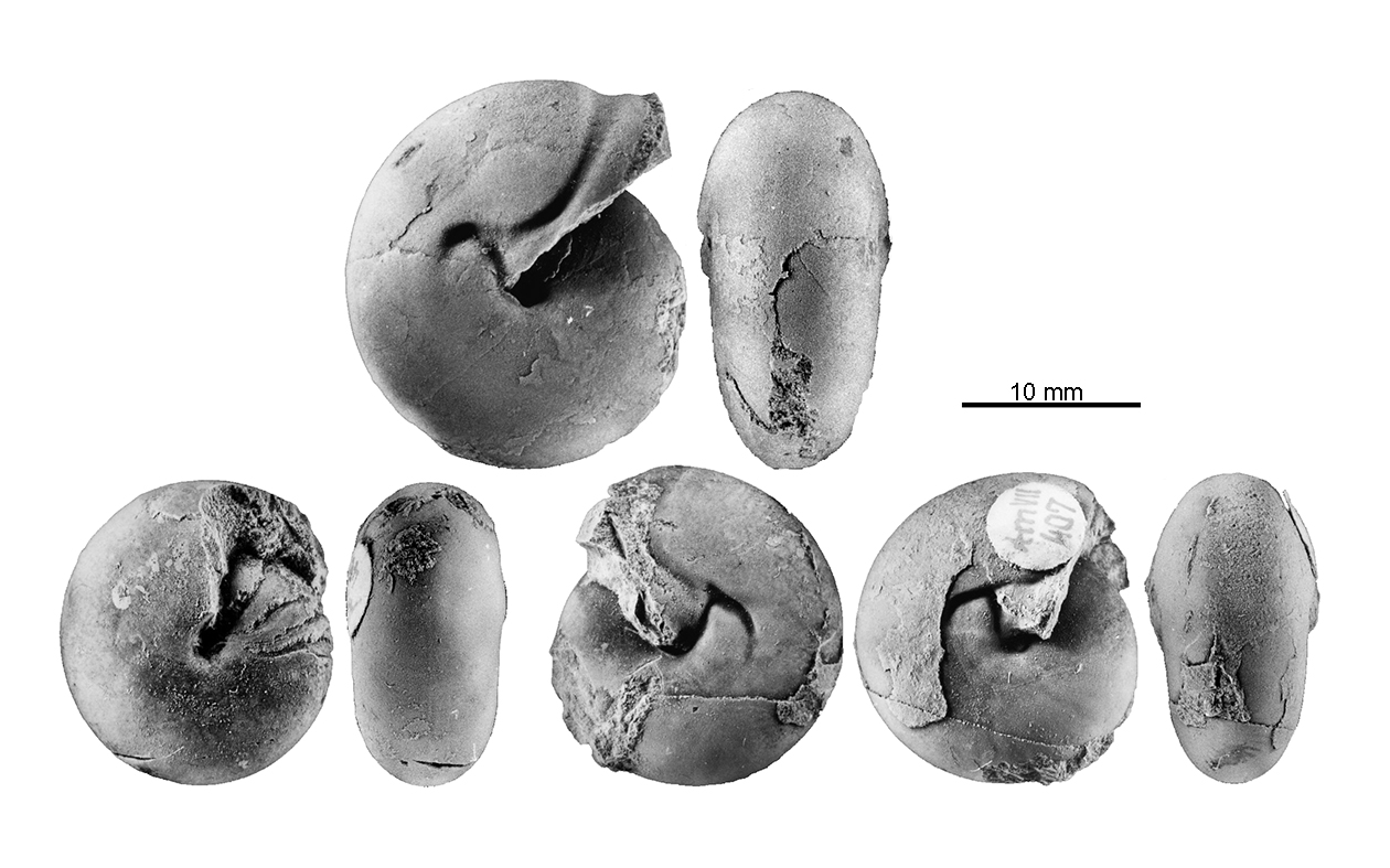 Diagnoza Discoidal conchs of simple geometry with £-shaped internal thickening near aperture; suture with shallow flank lobe; umbilicus closed at juvenile stages. Porównanie Roinghites bottkei Korn, 2002 from the Platyclymenia annulata black shale at Kattensiepen is a closely related species different in a somewhat larger mature size, more discoidal conch, and less prominent internal shell thickenings. The single specimen from Jabłonna attributed here does not show suture and bears numerous serial conch constrictions or thickenings on flanks. Its taxonomic identification is highly tentative. Autekologia Występowanie geograficzne Ostrówka, Besówka, and Łagów-Dule, possibly also Jabłonna. Zasięg czasowy P. trachytera Zone. Materiały muzealne ZAPL: 33 specimens. Literatura Dzik, J. 2006. The Famennian "Golden Age" of conodonts and ammonoids in the Polish part of the Variscan sea. Palaeontologia Polonica 63, 1-359. |