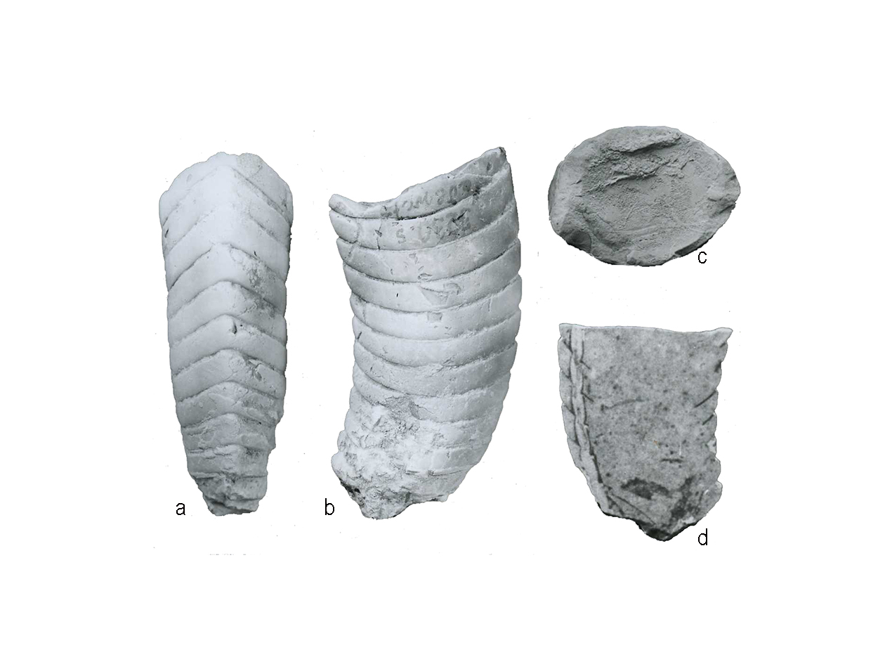Relatively short, exogastrically curved conchs with almond-shaped cross section, ventral side sharp; thick growth lines arched in outline and running obliquely, forming a sharp sinus at the ventral side.