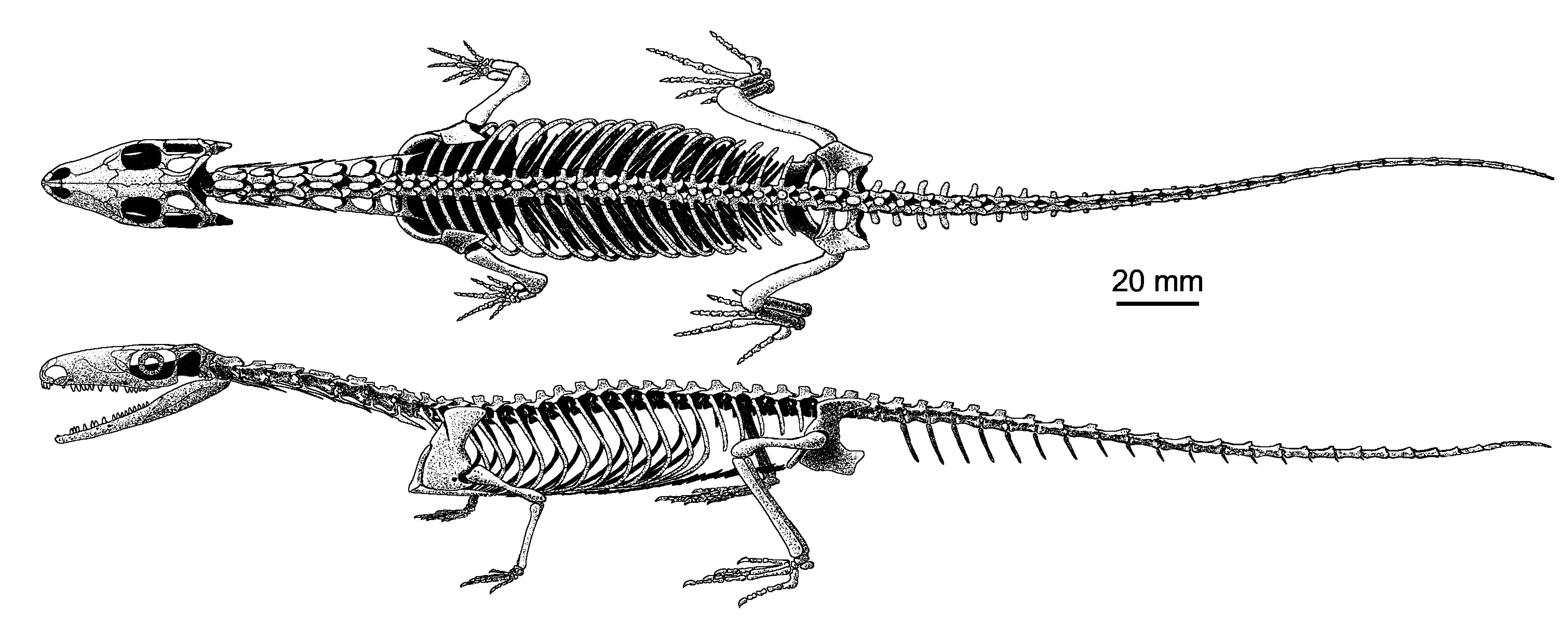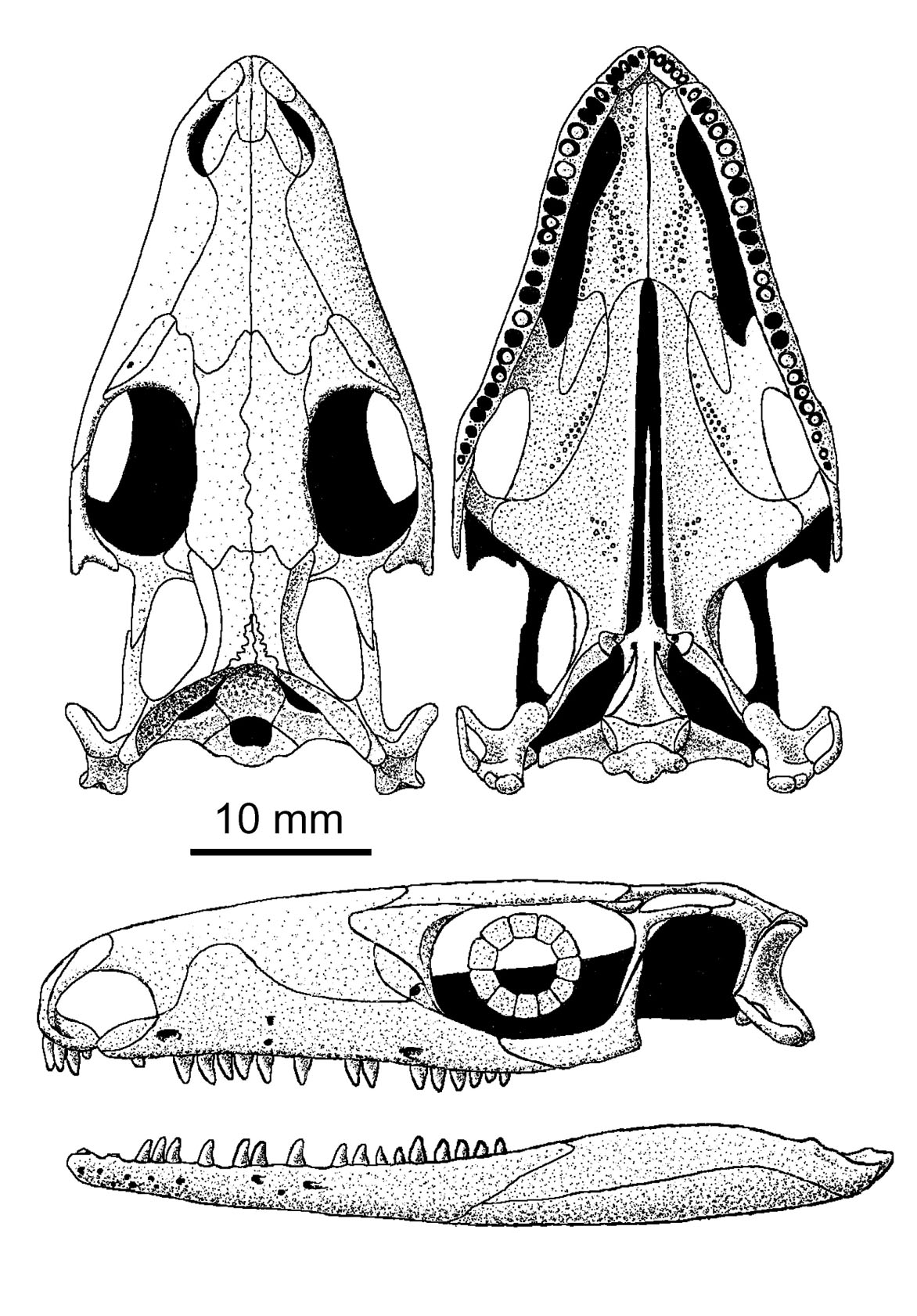 Diagnoza Czatkowiella resembles early archosauromorphs (notably those traditionally grouped as “prolacertiforms”), and differs from lepidosauromorphs in having strongly elongated cervical vertebrae with long low neural spines and slender horizontally placed cervical ribs with an anterior process; it resembles the Late Triassic gliding kuehneosaurs and some archosauriforms, and differs from all described “prolacertiforms”, in having three-headed ribs on some anterior trunk vertebrae, but differs from kuehneosaurs in that these ribs do not attach to the ends of elongated transverse processes; resembles Rhombopholis in having expanded spines on the dorsal vertebrae, but differs in the other vertebral characters noted above; resembles the Late Permian Protorosaurus in combining long cervical vertebrae and slender horizontal cervical ribs with a primitive premaxilla lacking a posterolateral process, but differs in having a biradiate postorbital bone, paired parietals without a median crest, and cervical vertebrae that are proportionally longer in relation to their height, in the possession of some three-headed ribs, in having short dorsal vertebrae with a greater development of a spine table, and in lacking the bifid caudal neural spines that characterize all specimens of the Late Permian genus. In its combination of characters, Czatkowiella is unique and justifies distinct generic status. As reconstructed on the basis of most frequent bones, the skull of Czatkowiella harae was about 40 mm in length (on average), and is thus much shorter than that of Prolacerta broomi B.P.I. 2675 (about 70 mm). However, the presence of very small and very large maxillae demonstrates a range of variability that is consider to be intraspecific. Porównanie Czatkowiella is relatively well known compared to other early diapsids but it has still proved difficult to classify. It shows skull and vertebral characters once thought diagnostic of the long-necked “prolacertiforms” (loss of the parietal foramen, distinct transverse processes on the dorsal vertebrae, double-headed ribs), but most recent (1998-2009) cladistic analyses have failed to support a monophyletic Prolacertiformes. Analysis suggests a relationship between Czatkowiella and the Late Permian Protorosaurus at the base of Archosauromorpha. Czatkowiella is thus to be considered a survivor of the Permian stage of archosauromorph phylogeny. However, this needs to be confirmed with a more detailed analysis at the new material of Protorosaurus. If this hypothesis of relationship is correct, then the similarities found between the cervical vertebrae and ribs of Protorosaurus (sensu stricto) and traditional “prolacertiforms” probably represent the retention of primitive character states, possibly synapomorphic for Archosauromorpha, or, given the cervical morphology of the basal diapsid Petrolacosaurus, for a more inclusive group. Autekologia Terrestrial, probably carnivorous. Występowanie geograficzne Only locus typicus. Zasięg czasowy Only stratum typicum. Materiały muzealne Institute of Paleobiology PAN, Warsaw (ZPAL) Literatura Borsuk-Białynicka, M. and Evans, S.E. 2009. A long-necked archosauromorph from the Early Triassic of Poland. Palaeontologia Polonica 65, 203–234. |