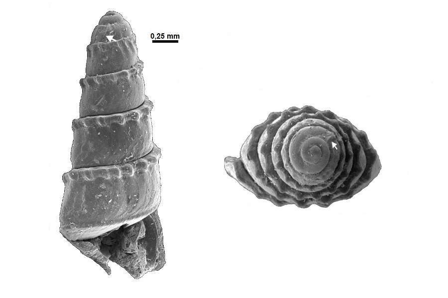 | Diagnoza Protoconch having 2.25 smooth, low spired whorls and demarcated from teleoconch with thickened outer lip. Teleoconch higly conical with spiral rib ornamented by broad nodes situated close to the adapical suture. Nodose rib forming narrow adsutural platform. Porównanie Similar to Diatrypesis guerrei (Hébert & Eudes−Deslongchamps,  1860) but the latter differs in having opisthocyrtic axial ribs. Also, some species of Cimolithium are very similar to D. kurushini, especially Cimolithium eleanorae Allison, 1955 and Cimolithium aff. eleanorae Allison,1995. Autekologia Występowanie geograficzne Only in type locality Zasięg czasowy Early to Late Valanginian (Early Cretaceous). Materiały muzealne 21 shells (ZPAL) Literatura Kaim, A. 2001. Faunal dynamics of juvenile gastropods and associated organisms across the Valanginian transgression-regression cycle in central Poland. Cretaceous Research 22, 333‒351. Kaim, A. 2004. The evolution of conch ontogeny in Mesozoic open sea gastropods. Palaeontologia Polonica 62, 3–183. |