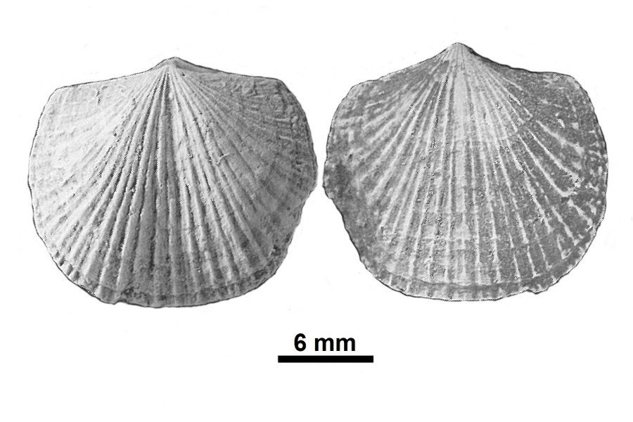| Diagnoza Shell rather small, slightly to markedly transverse, ventribiconvex; maximal width at 2/3 - 4/5 of the length, maximal thickness in the posterior region; dorsal valve convex, with sulcus appearing near the umbo, very narrow and slit-like posteriorly, gradually broadening towards the anterior commissure; dorsal umbo fine and delicate, incurved; ventral valve pyramidal, distinctly triangular in anterior view; ornamentation of thin radial costae and costellae, those in the centre of each valve straight, the lateral ones bending abaxially, separated by wider furrows. Porównanie This is one of the characteristic though not abundant forms in the Givetian beds of the Holy Cross Mountains; German specimens are with a slightly lower ventral interarea, and a somewhat smaller ventral beak. Autekologia Występowanie geograficzne Germany (Eifel, Gerolstein) and Poland (Holy Cross Mountains). Zasięg czasowy Mid Devonian, Late Eifelian to Givetian. Materiały muzealne 80 articulated shells and 39 isolated valves from outcrop SK-3 at Skały, (ZPAL Bp IV; L PZ-D.559, olim 773; MGUWr 1963s, 1972s); Gurich's material; 10 shells from the Eifel region (Kayser's collection), MB.B.2408.1-1 0. Literatura Gurich, G. 1896. Das Palaeozoicum im polnischen Mittelgebirge.- Verh. Russ.-Kais. Min. Ges. St.-Petersb. (2) 32: 1-539, Plates 1-15, map; St-Petersburg. Halamski, A.T. 2009. Middle Devonian Brachiopods from the northern Part of the Holy Cross Mountains, Poland in relation to selected coeval faunas. Part One: Introduction, Lingulida, Craniida, Strophomenida, Productida, Protorthida, Orthida. Palaeontographica Abteilung A, 287: 41-98. Kayser, E. 1871. Die Brachiopoden des Mittel- und Ober-Devon der Eifel. Z. deutsch. geol. Ges. 23: 491-647, Pls 9-14; Berlin. Sobolew, 1904a. Devonskia otlozenia profila Grzegorzevice-Skaly-Vloxi. Izv. Varsav. Politex. Inst. 1904: 1-107, Pls 1-9, map; Varsava. Sobolew, D. 1909. Sredniy devon Kelecko-Sandomirskago Krah. Mat. geol. Ross. 24: 43-536, Plates 2-6; St. Petersburg, Moskva. |
