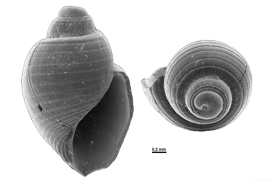 Protoconch clearly demarcated from teleoconch, almost coaxial, smooth. Shell broadly spindle-like, 1.53 times as high as broad. Teleoconch starting with two distinct adapical striae and two to three weakly visible lateral spirae. Later shell with well developed, evenly spaced lateral striae (including that on base). Teleoconch whorls rounded with narrow,  well pronounced adapical ramp. Peristome elongated. Columellar area with narrow inner lip. Umbilical chink narrow. Porównanie